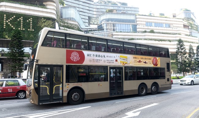 香港雙層公交車身廣告每日18小時運營,涵蓋早市、午休、夜經濟三大消費決策波段,高頻次循環曝光形成“視覺記憶鏈”。上層車廂(4.3米高度)平行對接寫字樓視域,商務人群接觸時長5-15分鐘/次。雙層車身廣告面積超35㎡,是普通公交的2.3倍,車身側面的12米超長展示面,在狹窄街巷中形成強制性視覺焦點。