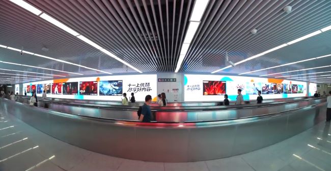 杭州地鐵創景路站A出入口通道墻面超長LED大屏廣告形成一種包裹感和視覺上的連貫性。當乘客穿行通道時,廣告畫面可以伴隨其行進軌跡,帶來更強的視覺沖擊和沉浸感。LED屏幕支持動態視頻播放,相比靜態燈箱,色彩更鮮艷,表現力更強。這種形式非常適合展示品牌高端形象或進行產品故事的生動講述,其逼真的視覺效果能顯著提升廣告的關注度和記憶度。