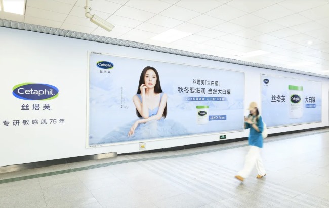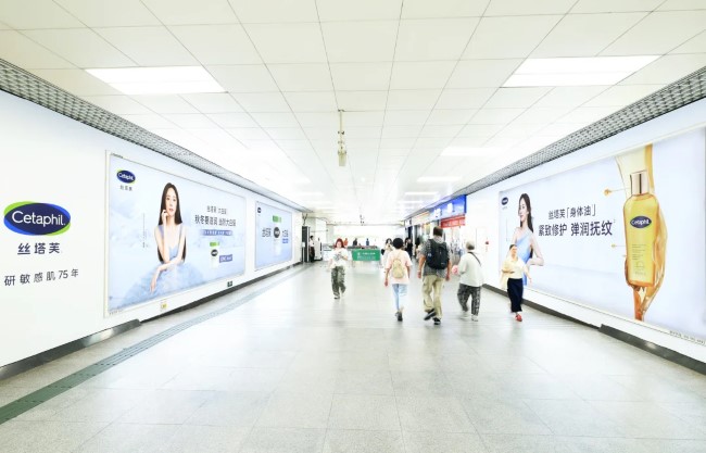 廣州地鐵體育西路出入口通道兩側墻面廣告設置于A出口通道兩側墻面,正處于乘客進出站行進動線的核心位置。一體化的設計幾乎占據了通道內主要的可視墻面,形成了強烈的視覺包圍感。超級燈箱在通道照明環境下,其內置光源能使畫面保持較高的視覺亮度和色彩飽和度,從而在相對封閉的通道空間中成為突出的視覺焦點。三塊超級燈箱與連續墻貼的組合,構成了規模化的展示陣列,能夠對通行乘客產生持續的視覺影響,有助于品牌形象的統一和強化。