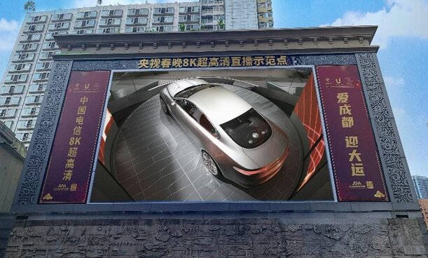 位于中國特色商業街——春熙路步行街北口,中西部地區首塊8k超高清戶外屏。使用超高清視頻攝錄編的設備技術,圍繞四川省著名景點、地標、非遺等開展8K短片、8k+3D、8K慢直播等展示活動,發揮8K超高清的技術優勢。利用“超高清的畫質、超穩定的顯控系統”,結合地理位置優勢,完美呈現宣傳視頻內容,并將活動宣傳力度最大化。