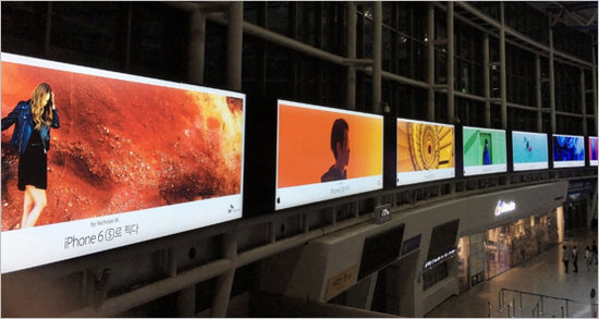 7月,蘋果公司又開始了新一輪的廣告轟炸,這一次主題名為 “Colors(色彩)”,仍然以用iPhone手機拍攝的照片為廣告畫面,不同的是,這次的廣告投放多以燈箱、大牌為主,而且聯(lián)裝燈箱一發(fā)就是一大串,赤橙黃綠青藍(lán)紫亮成一道彩虹。