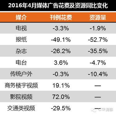 CTR市場研究媒介智訊最新研究數據顯示,2016年4月廣告市場(不含互聯網)同比下降4.9%。其中,傳統媒體同比下降6.9%。