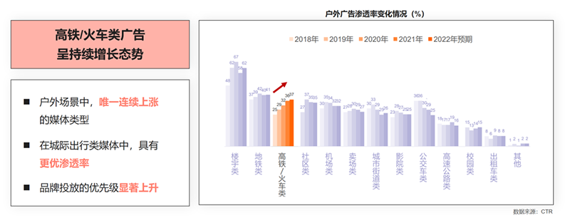 根據(jù)CTR數(shù)據(jù),高鐵火車站廣告近年來是唯一呈現(xiàn)連續(xù)增長態(tài)勢的媒體,側(cè)面佐證了高鐵平臺為品牌傳播賦能增勢的價(jià)值越來越受品牌主認(rèn)可。