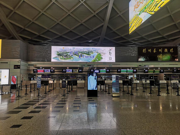 揚(yáng)泰機(jī)場(chǎng)二層出發(fā)大廳值機(jī)柜臺(tái)上方燈箱廣告