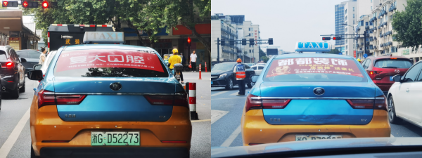 后視窗廣告帶來極強的視覺沖擊力和吸引力。義烏出租車后窗貼廣告的高度位置正好與司機、行人視線持平,且位于司機的正前方,垂直于視線,觀看視角絕佳,可以將廣告信息近距高地傳播給受眾,達到最大的可視機會。