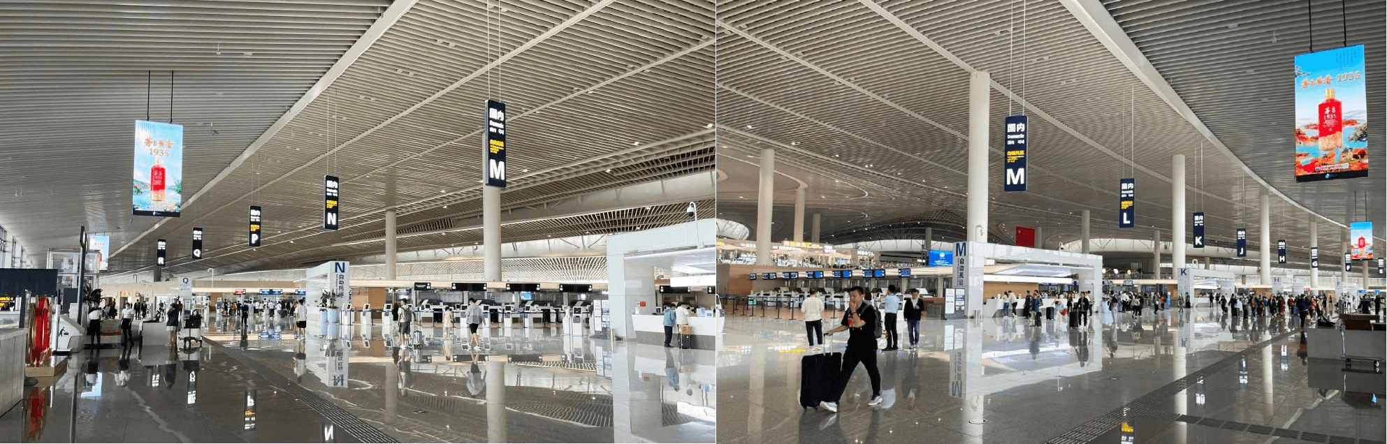 吊旗廣告一般位于人流密集區域的正上方,廣告面積超大雙面展示,可視范圍達360度,且高度和位置優勢常常讓吊旗廣出現在旅客的打卡照片中二次傳播。今天第一戶外小編帶來的是青島膠東機場出發值機大廳吊屏LED廣告價格和優勢。