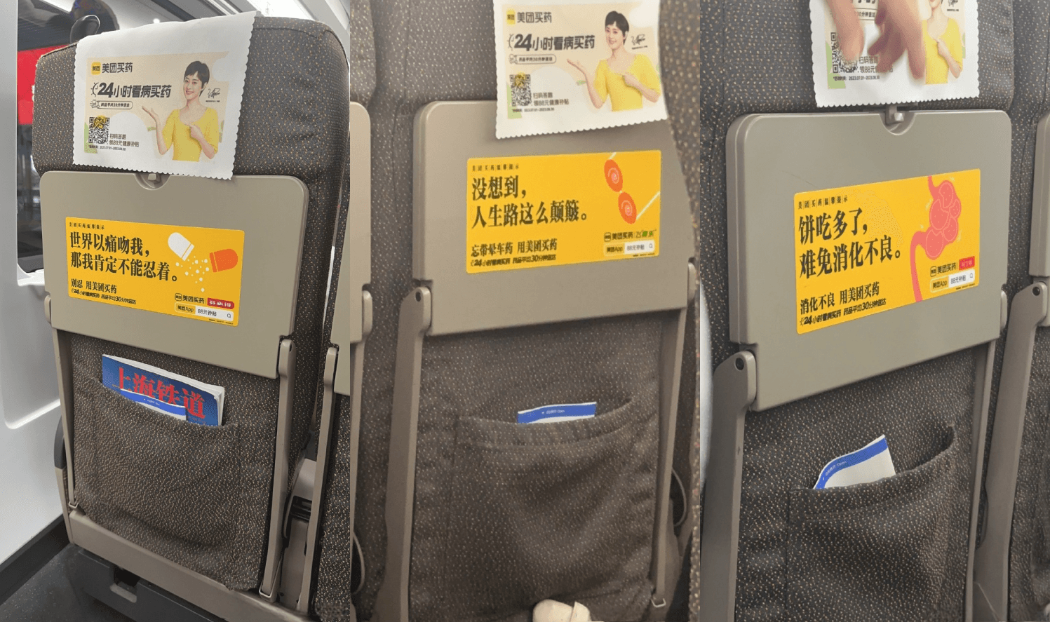 美團買藥通過高鐵列車桌板貼廣告把一條條自帶自帶冷笑話的廣告語,以醒目的品牌顏色亮眼明黃色呈現在乘客眼前,網友直呼哈哈哈哈哈哈的同時感同身受:“廣告里這只嗎嘍(猴子)在演繹換季時打噴嚏的我”。