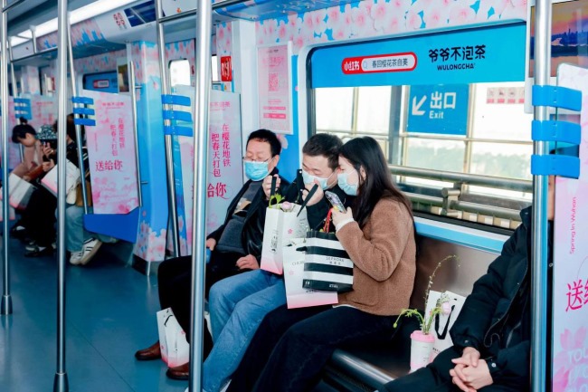 武漢地鐵廣告價格收費,武漢地鐵列車廣告內外包車廣告櫻花案例圖