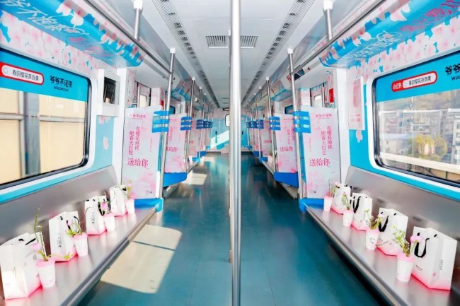 武漢地鐵1號線是武漢唯一可發布外車身廣告的地鐵線路,本次全仔給大家帶來的經典案例來自爺爺不泡茶×回春丹樂隊聯名發布的櫻花專列,正值武漢櫻花季,粉綠相間的外包車廣告設計穿梭在江城的地鐵軌道,讓櫻花與春風在武漢地鐵上相遇。廣告畫面醒目吸睛自帶話題度適合事件營銷,內外包車廣告相結合,沉浸式體驗車廂內視覺盛宴,封閉空間媒體內容干擾小、乘坐地鐵乘客閱讀時間長、受眾關注度高,更易建立品牌好感,促進二次傳播。適合品牌新品上市、節點營銷等類型的宣傳需求。