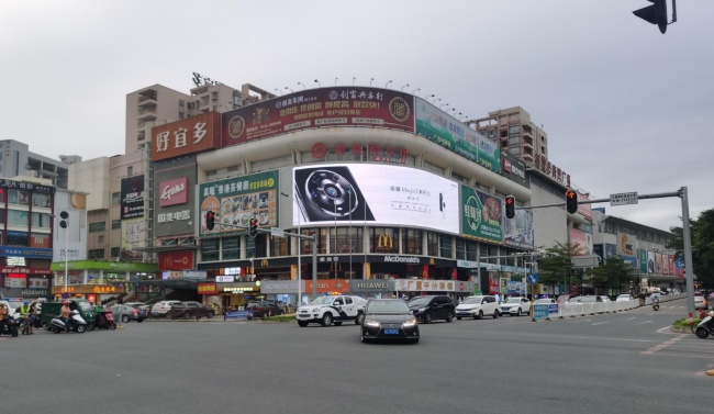 媒體優勢:位于惠陽核心區域主干道白云五路與崇雅路路口交匯處,大屏位于購物中心外立面以及紅綠燈路口上方,人車流量大,視野良好,等候紅綠燈增加廣觀看時長。好宜多LED廣告呈現曲面展示,展示角度超180度,覆蓋路口多方向人流與車流。人流量:近50萬人次/天,車流量:近30萬人次/天。
