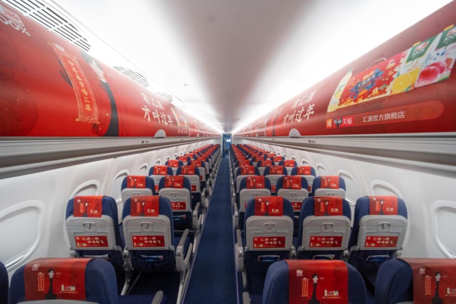 華夏航空飛機(jī)客艙內(nèi)行李架彩貼頭枕巾小桌板貼三件套廣告