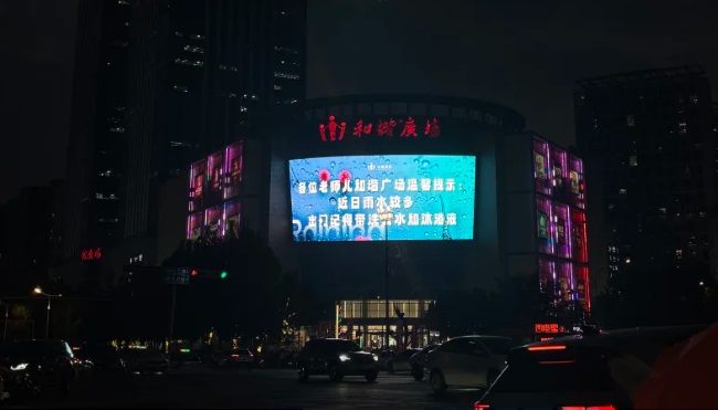 濟南和諧廣場外墻LED大屏廣告獨特的弧形設計在建筑立面上形成了獨特的視覺張力,不僅與建筑外觀更好融合,還能提供更寬廣的視角覆蓋,在復雜的城市環境中保持強烈的視覺存在感與沖擊力。大屏位于商場外墻玻璃幕墻上方高處醒目位置,視野開闊,無遮擋,使廣告信息能夠遠距離清晰辨識,實現了對主干道雙向車流及行人的廣域覆蓋。高頻次的播放策略能夠對日間不同時段經過的龐大人流和車流進行反復提示,有效利用乘客和駕駛者的碎片化等待時間,強化品牌認知。